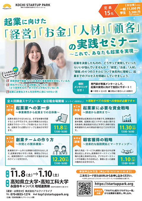 ■開催概要 【定員】15名(先着順,要予約) 【参加費】学生:3,300円(税込) ※社会人学生を除く 一般:11,000円(税込) ※申込みをいただいた方から、順次、納付書をお送りします。 記載された期限までに、指定の銀行口座へ振り込みをお願いします。 【申込方法】 ①こうちスタートアップパークの「起業に向けた「経営」「お金」「人材」「顧客」の実践セミナー ~これで、あなたも起業を実現~(全4回)」のホームページ下部にある「申し込む」ボタンをクリック。 ②マイページにログイン後、必要事項をご記入いただき送信。 ※申込〆切:2025年10月31日(金)17:00 |