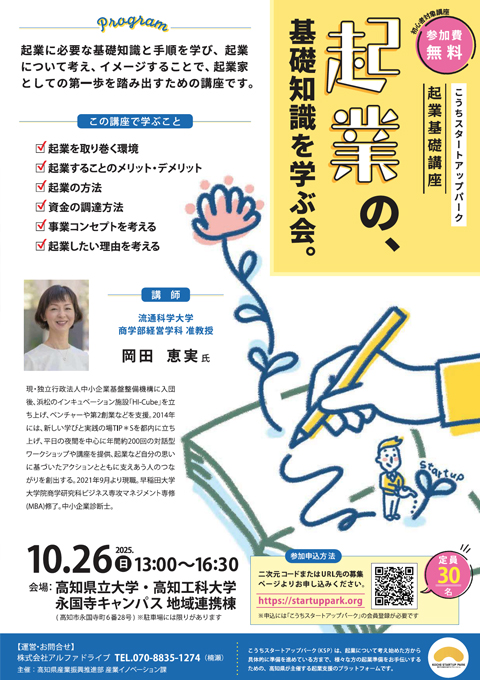 ■開催概要 ・定員:30名(先着順、要予約) ・参加費:無料 ■申し込み方法 ・こうちスタートアップパークの「第2回 起業基礎講座 起業の基礎知識を学ぶ会」のホームページ下部にある「申し込む」ボタンをクリック。 ・マイページにログイン後、必要事項をご記入いただき、送信。 ※会場開催のみ、オンライン配信はございません。 ※駐車台数に限りがございます。満車の場合は近隣駐車場(有料)のご利用をお願いします。 |
