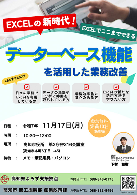 事前予約制となっておりますので、お電話又はチラシのQRコード又は高知市商工振興部産業政策課のHPからご予約をお願いいたします。 ・参加無料 ・定員10名(先着順) ・ 持物:メモ、筆記用具、パソコン |
