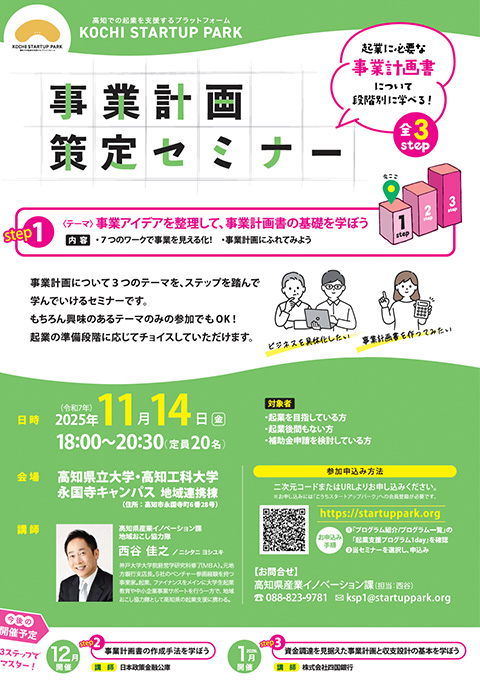 STEP①“事業アイデアを整理して、事業計画の基礎を学ぼう!” 事業計画書について3つのテーマを、ステップを踏んで学んでいけるセミナーです。 もちろん興味のあるテーマのみの参加でもOK!起業の準備段階に応じてチョイスいただけます。 ■内容 ・7つのワークで事業を見える化! ・事業計画にふれてみよう ■対象 ・起業を目指している方 ・起業後、間もない方 ・補助金申請を検討している方 など ■こんな方にオススメ ・ビジネスを具体化したい ・起業に向けて準備を進めている ・事業計画書をつくってみたい ・金融機関へ融資の申請を考えている ・補助金の申請を考えている ■講師 西谷 佳之 氏(高知県産業イノベーション課 地域おこし協力隊/元 銀行員 ) 神戸大学大学院経営学研究科修了(MBA)。 地方銀行で4ヶ店の支店長を務めたのち、視野を広げた企業サポートを目指して独立。 大阪大学にて「特定研究大学改革促進事業」に携わった後、事業家として合計5社のベンチャー経営に参画。 起業、マーケティング、ファイナンスをメインとした中小企業の事業サポートに加え、大学にて起業教育を行う一方で、令和6年9月から高知県地域おこし協力隊として高知県内の起業支援に携わる。 |