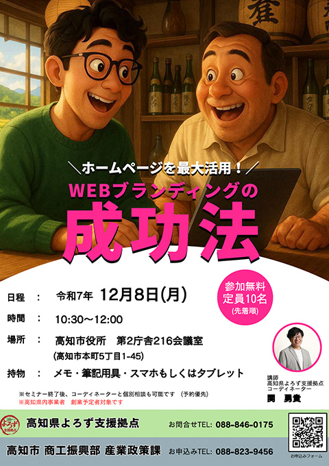 事前予約制となっておりますので、お電話又はチラシのQRコード又は高知市商工振興部産業政策課のHPからご予約をお願いいたします。 ・参加無料 ・定員10名(先着順) ・持物:メモ、筆記用具、スマホもしくはタブレット ※セミナー終了後、コーディネーターと個別相談も可能です。(予約優先) ※高知県内事業者、創業予定者対象です。 |