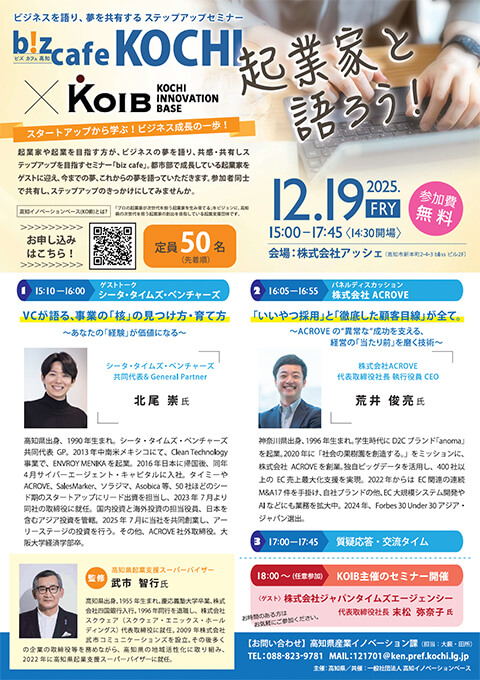 起業家や起業を目指す方が、ビジネスの夢を語り、共感・共有する場所「biz cafe」。 都市部で成長している起業家をゲストに迎え、今までの夢、これからの夢をかたっていただきます。 参加者同士で夢を共有し、ステップアップに向けたきっかけにしてみませんか。 ■こんな方に特におすすめです! ・起業に興味がある学生 ・これから起業を検討されている方、既に起業している経営者 ・事業戦略の経験談についてお聞きしたい方 ・都市部の経営者とのコネクションを築きたい方 ・スタートアップ企業経営者と交流されたい方 など ■セミナー内容 ①15:10~16:00 ゲストトーク ○テーマ:VCが語る、事業の「核」の見つけ方・育て方 ~あなたの「経験」が価値になる~ ○ゲスト:シータ・タイムズ・ベンチャーズ 共同代表 & General Partner 北尾 崇 氏 高知県出身、1990年生まれ。シータ・タイムズ・ベンチャーズ共同代表GP。2013年中南米メキシコにて、Clean Technology事業で、ENVROY MENIKAを起業。2016年日本に帰国後、同年4月サイバーエージェント・キャピタルに入社。タイミーやACROVE、Sales Marker、ソラジマ、Asobica等、50社ほどのシード期のスタートアップにリード出資を担当し、2023年7月より同社の取締役に就任。国内投資と海外投資の担当役員、日本を含むアジア投資を管轄。2025年7月に当社を共同創業し、アーリーステージの投資を行う。その他、ACROVE社外取締役。大阪大学 経済学部卒。 ②16:05~16:55 パネルディスカッション ○テーマ:「いいやつ採用」と「徹底した顧客目線」が全て。 ~ACROVEの“異常な“成功を支える、経営の「当たり前」を磨く技術~ ○ゲスト:株式会社ACROVE 代表取締役 社長執行役員 CEO 荒井 俊亮 氏 神奈川県出身、1996年生まれ。 学生時代にD2Cブランド「anoma」を起業。2020年に「社会の果樹園を創造する。」をミッションに、株式会社ACROVEを創業。独自ビッグデータを活用し、400社以上のEC売上最大化支援を実現。2022年からは EC関連の連続M&A17件を手掛け、自社ブランドの他、EC大規模システム開発やAIなどにも業務を拡大中。2024年、Forbes 30 Under 30 アジア・ジャパン選出。 ③17:00~17:45 質疑応答・交流タイム ◆18:00~KOIBが主催するセミナーが開催されます。(任意参加) ○ゲスト:株式会社ジャパンタイムズエージェンシー 代表取締役社長 末松 弥奈子 氏 お時間のある方はお気軽にご参加ください。 ■監修 高知県起業支援スーパーバイザー 武市 智行 氏 高知県出身、1955年生まれ。慶應義塾大学卒業後、株式会社四国銀行入行。1996年同行を退職し、株式会社スクウェア(スクウェア・エニックス・ホールディングス)代表取締役に就任。2009年株式会社武市コミュニケーションズを設立。その後、多くの企業の取締役等を務めながら、高知県の地域活性化に取り組み、2022年に高知県起業支援スーパーバイザーに就任。 |