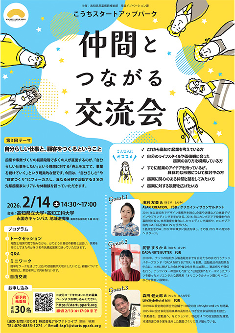 起業や事業づくりの初期段階で多くの人が直面するのが、「自分らしい仕事をしたい」という理想に対する「売上を立てて、事業を続けていく」という現実的な壁です。 今回は、”自分らしさ”や”顧客づくり”にフォーカスし、異なる分野で活動する3名の先輩起業家にリアルな体験談を語っていただきます。 ■こんな方におすすめ ・これから高知で起業を考えている方 ・自分のライフスタイルや価値観に合った起業のあり方を模索している方 ・すでに起業アイデアを持っているが、具体的な形態について検討中の方 ・起業に関心のある仲間と話をしてみたい方 ・起業に対する視野を広げたい方 ■プログラム ①トークセッション 理想と現実の間で悩みながら、どのように最初の顧客と出会い、事業を形にしてきたのかを3名の先輩起業家に語っていただきます。 ② Q&A ③ミニワーク 簡単なワークを通じて、自分の価値観や大切にしたいこと、顧客について言語化し、参加者同士で共有を行います。 ④自由交流 ■先輩起業家プロフィール※五十音順 ASARI CREATION, 代表 / クリエイティブコンサルタント 浅利 友美 氏 2014年に高知市でデザイン事務所を設立。企業や店舗などの商業デザインやブランディングを手がける。2016年にカンボジアで映像制作の事務所を設立。世界遺産を舞台にしたウェディング撮影や、カンボジア国内CM、日系企業のPVを手がける。 2拠点生活の末、2022年に東京に拠点を移し、その後2025年に高知市へUターン。 DADA NUTS BUTTER 代表 武智 まりか 氏 2018年、ナッツの焙煎から製造販売までを自分たちの手で行うナッツバターブランド「DADA NUTS BUTTER」を創業。活動拠点の高知県を中心に、土地に根ざした食材や食文化を見つめ直し、商品作りや発信を行う。ナッツバターの他にも"旅"と"伝統食材"をテーマにしたナッツを使ったオリエンタルな調味料『オリエンタルナッツ醬シリーズ』などを独自に展開中。 高知きんつぎ空き家協同組合 理事長 森田 健太郎 氏 2019年に愛宕商店街空き店舗で1棟貸切宿LifeStyleHotel ichiを開業。 2025年に空き家利活用事業の高知きんつぎ空き家協同組合を設立。 「負動産を、富動産へ」 をビジョンに、現在は4つの宿泊施設を運営。地域資源の空き家を活用した施設づくりに取り組んでいる。 |
