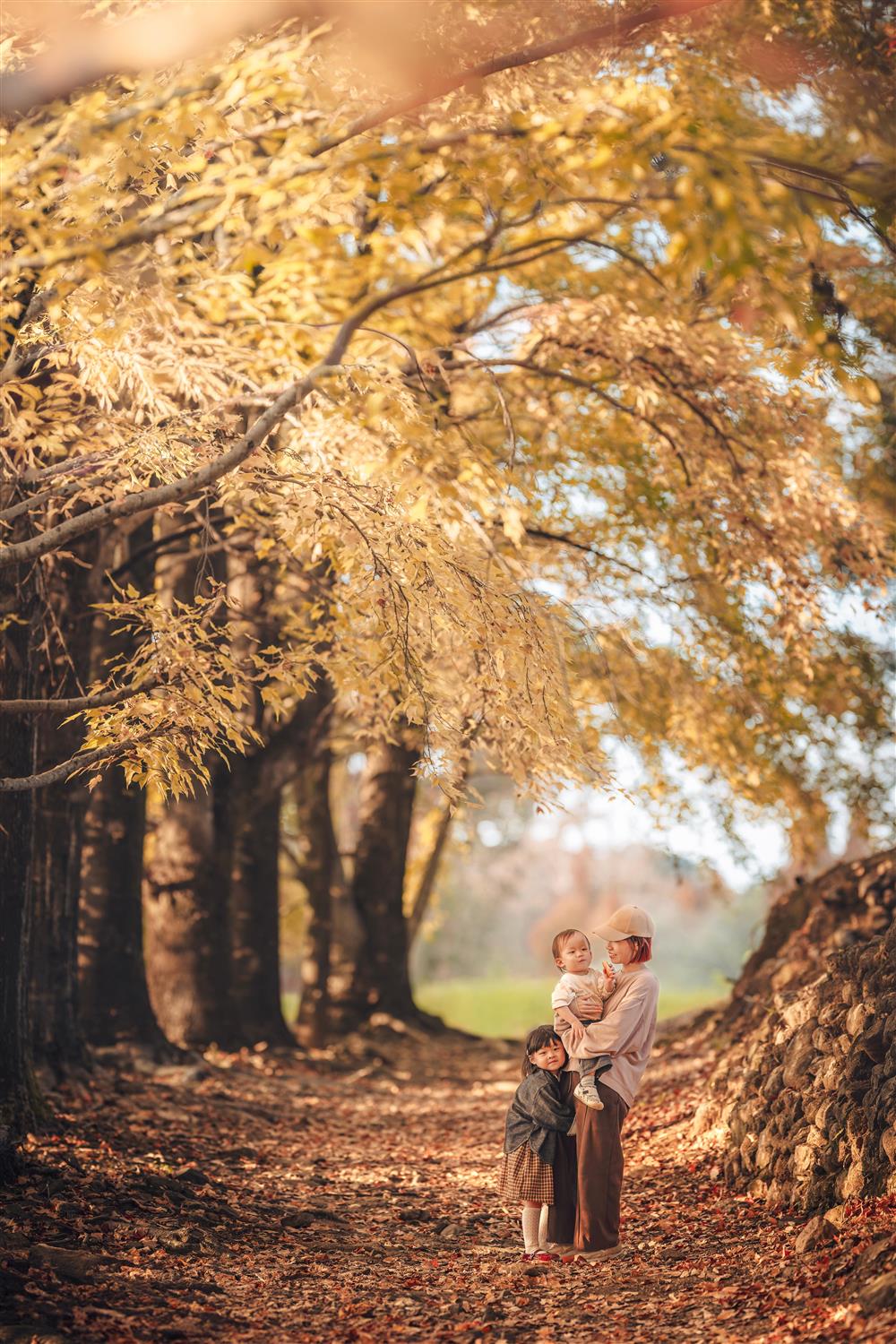 夕方、木々の間から光が降り注ぎ、黄金色に染まる葉っぱたちが美しい場所です。