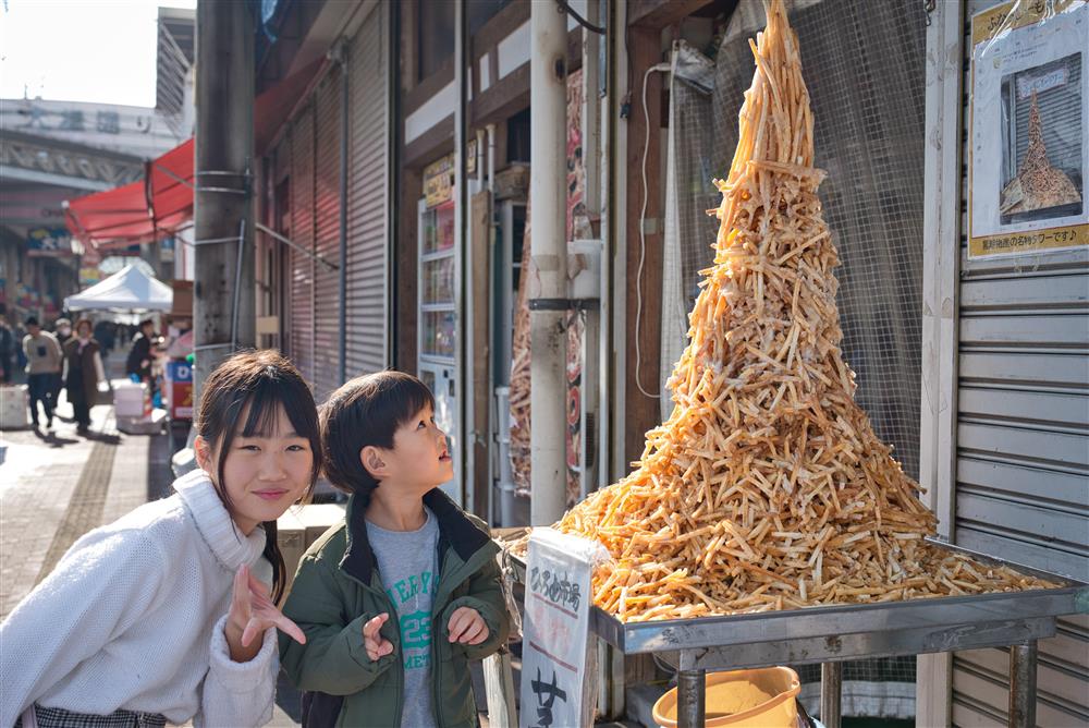 高知と言えば真っ先に思い浮かぶのがカツオのたたき、そして豪快に飲むお酒。子どもたちがその真骨頂を理解するのはまだまだ先のこと。それよりもお菓子が食べたい年ごろ。そこで最高においしく食べられ、子供たちが大好きなお菓子が高知の芋けんぴです。この日ももちろん芋けんぴを食べ歩きしてましたが、そんな芋けんぴの山を見つけて大興奮です。私もテンションが上がり、子どもたちと並んで写真を撮ろうとしましたが、芋けんぴの山の虜になった息子は全然こっちを向いてくれませんでした。何はともあれ、大人から子どもまで楽しめるグルメがある高知は非常に魅力的だと思いました。芋けんぴは手軽に食べられるし、日持ちするし、ヘルシーだし、小腹がすいた時にもってこいだし、お土産にも嬉しいし、と良いことだらけと改めて感じました。