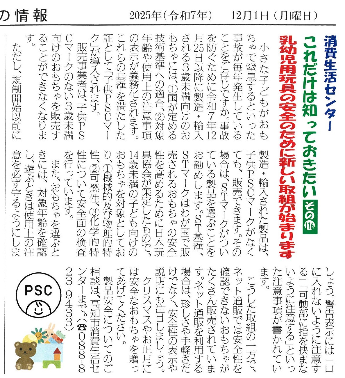 〇乳幼児用玩具の安全のために新しい取組が始まります 令和7年12月号